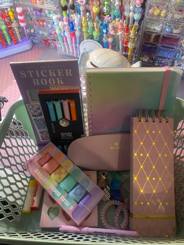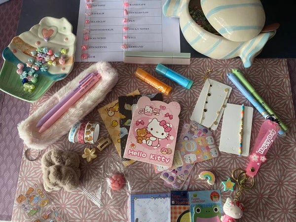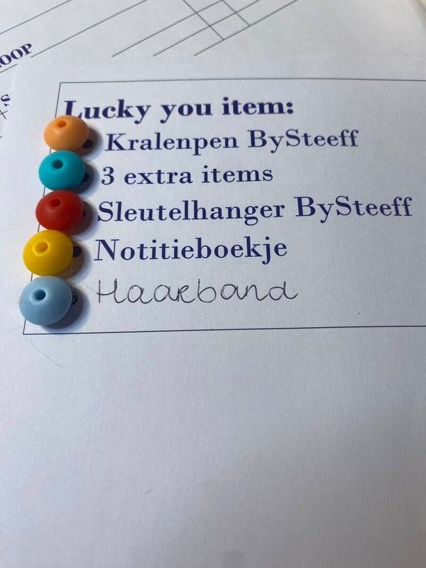 dat kan zijn een Kralenpen, 3 extra items, notitieboekje, haarband, armbandje