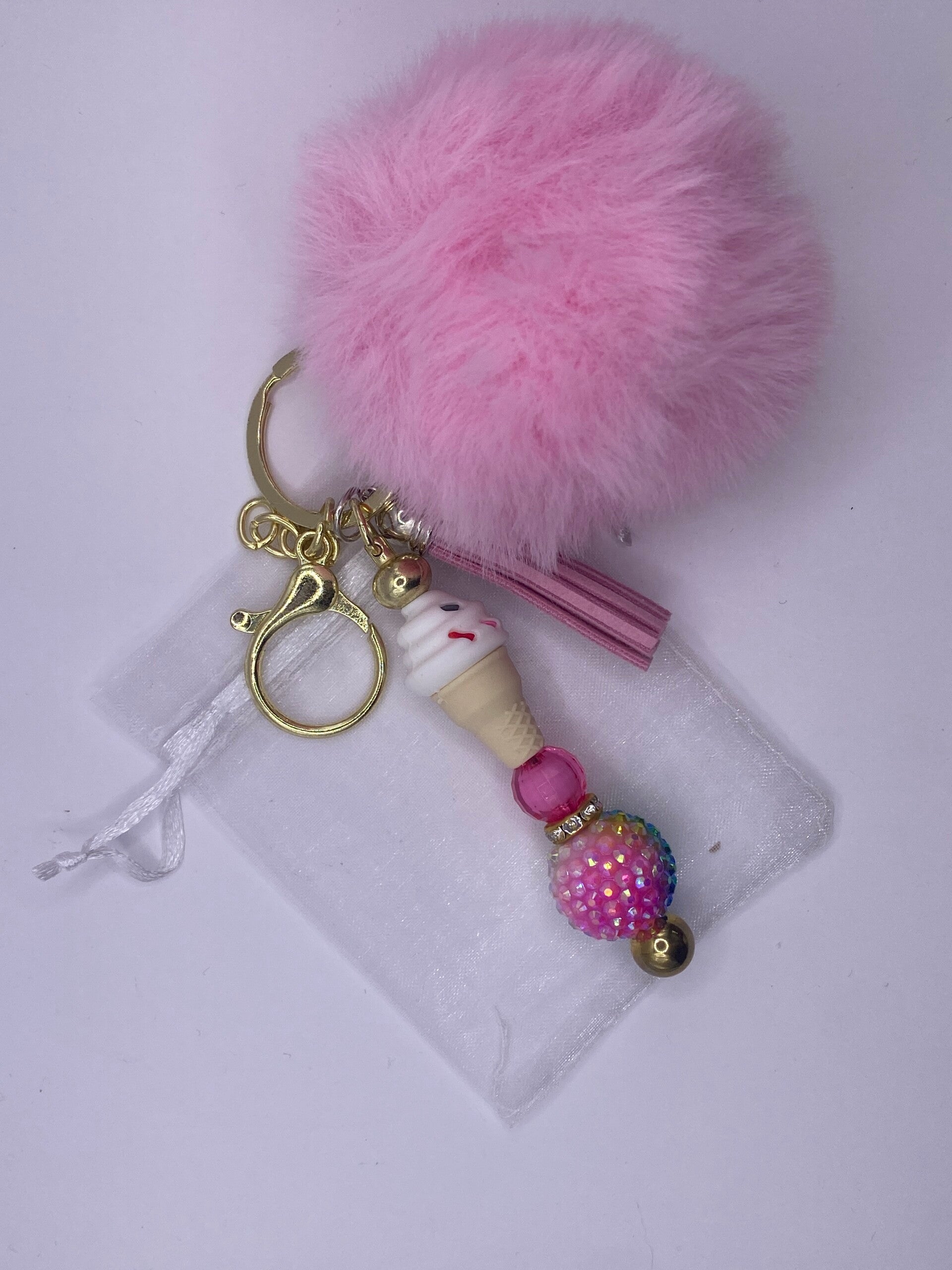 Sleutelhangers tashanger goudkleurig met ijsje en roze pompom