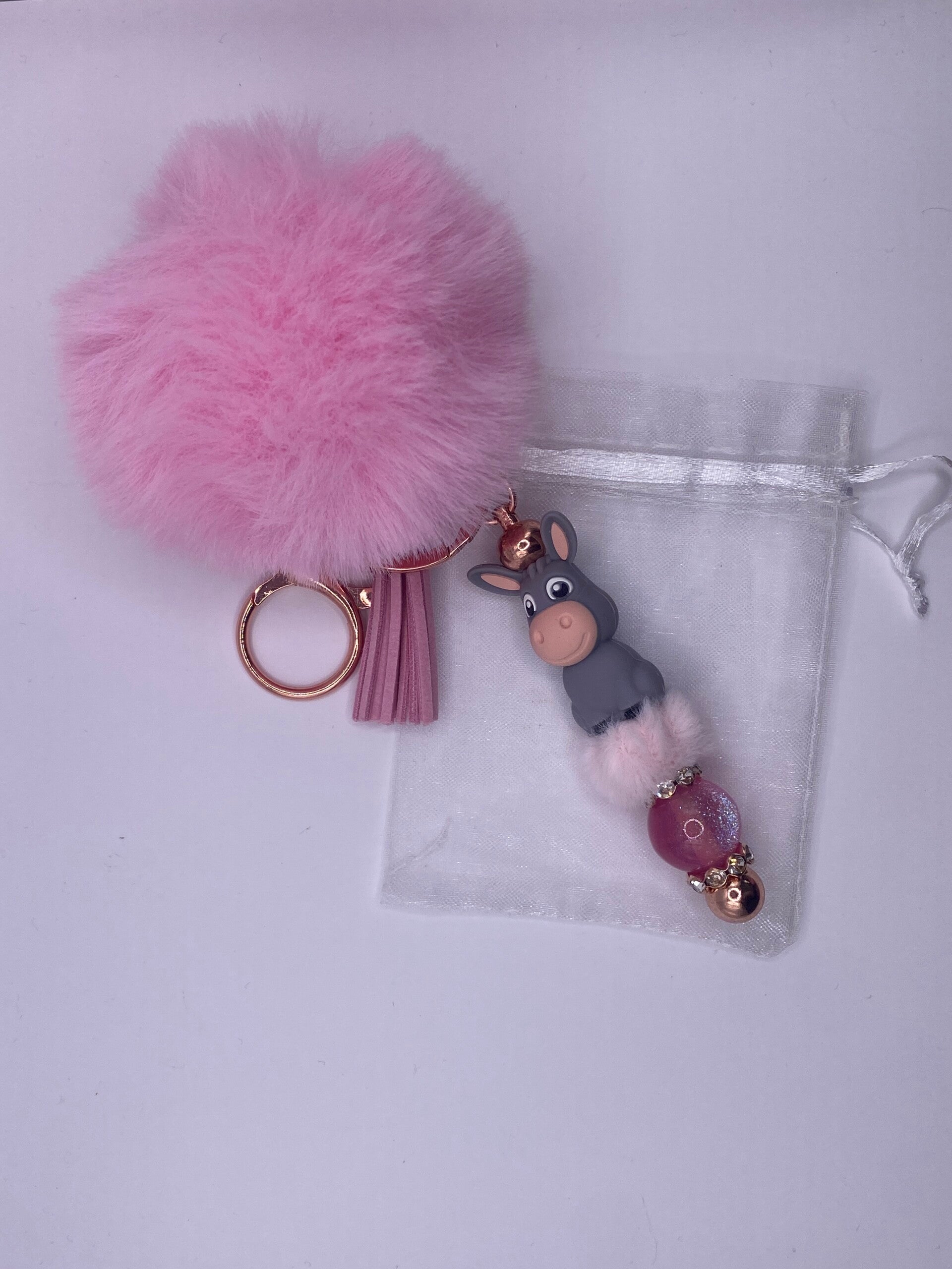 Sleutelhanger tashanger rosegoud met ezeltje en roze pompom